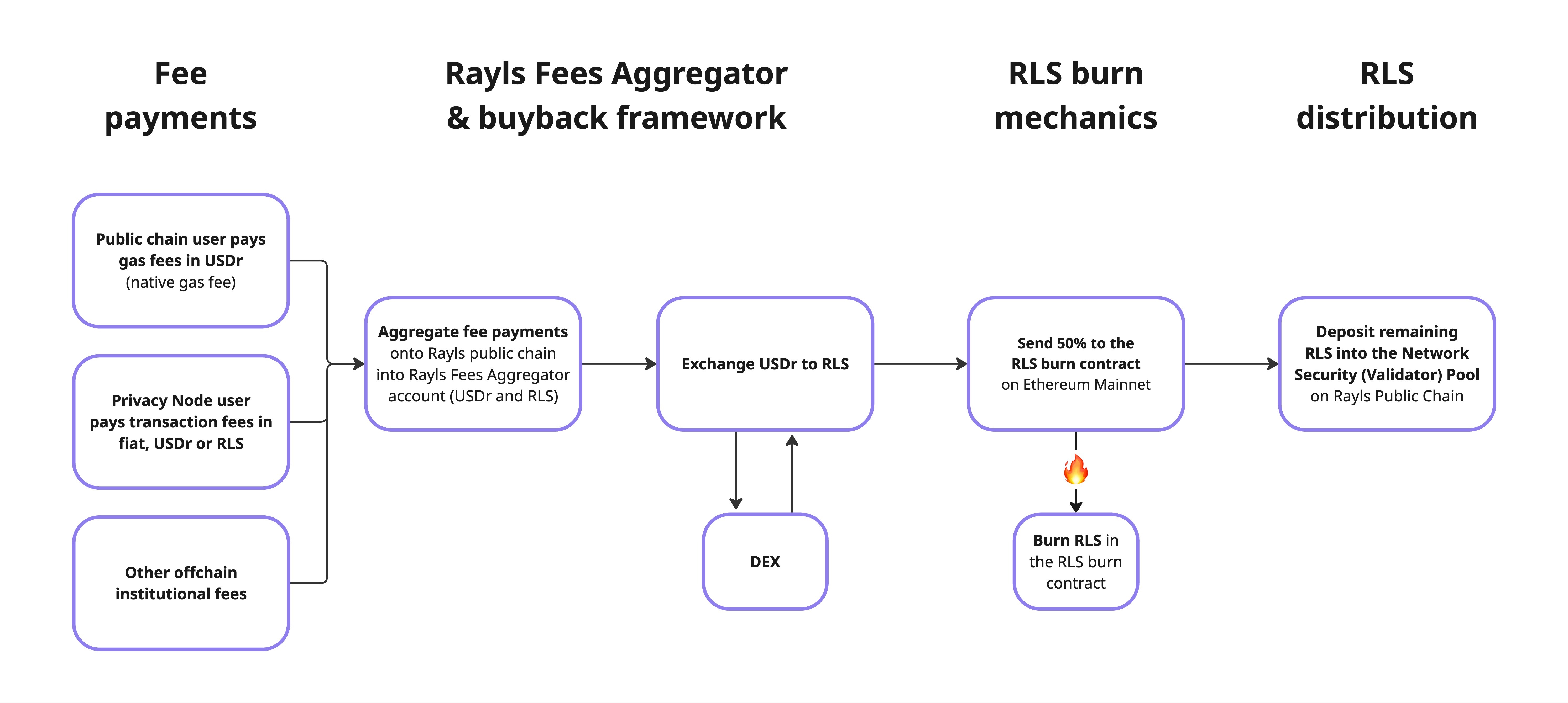 This cycle ensures that the Rayls Fees Aggregator is constantly replenished and used to purchase RLS, while a portion of that RLS is burned, creating consistent demand for the RLS token while simultaneously decreasing supply.